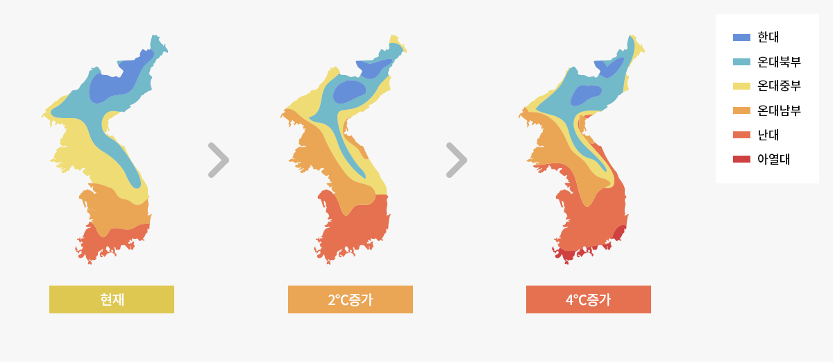 지구 평균의 2배에 달하는 온도 변화(지난 100년간 1.5도씨)로 우리나라가 아열대화되고 있습니다. 또한 해수면 상승은 지구 평균의 3배(제주도 기준 지난 40년간 22cm), 수온 상승도 지구 평균의 3배(동해 기준 지난 100년간 1.1~1.6도씨)에 달합니다. 이로 인해서 열대야 일수 증가, 여름철 기간 증가, 농작물, 해양생물 등의 변화를 초래하여 우리 생활에 직간접적인 영향을 미치고 있습니다.